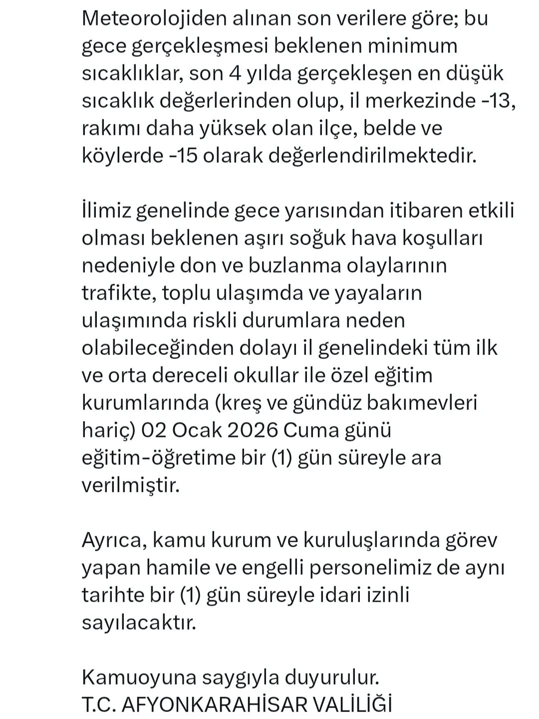 Afyonkarahisar Valiliği sosyal medya hesaplarından yaptığı açıklamada, aşırı soğuk olması ve hava koşulları nedeniyle il genelinde tüm okulların 1 gün süreyle tatil edildiğini duyurdu.
