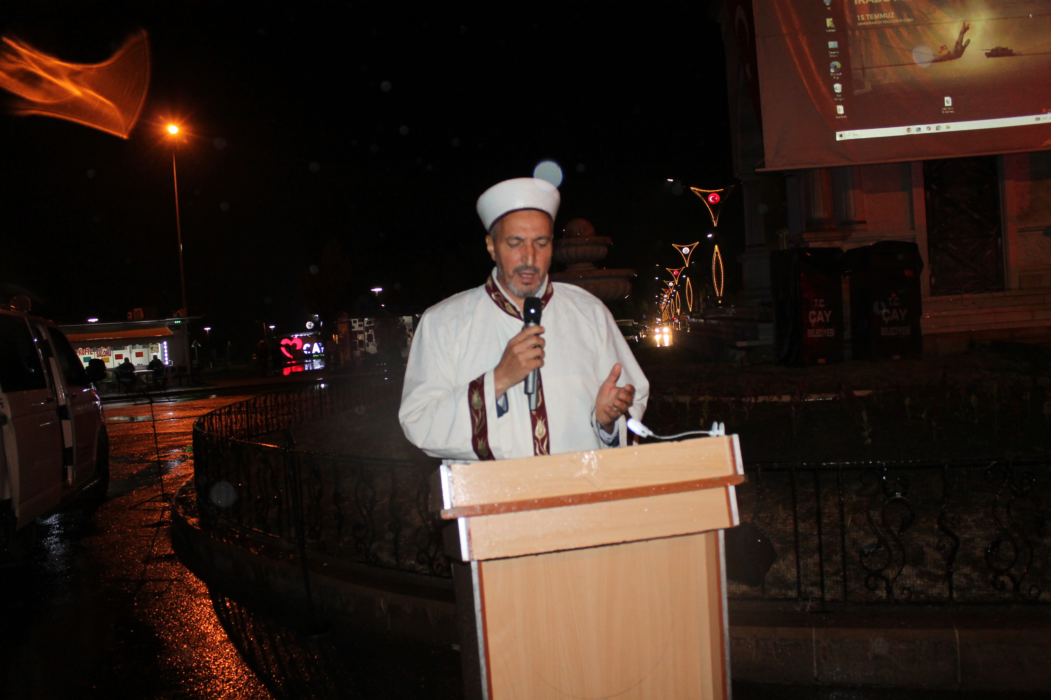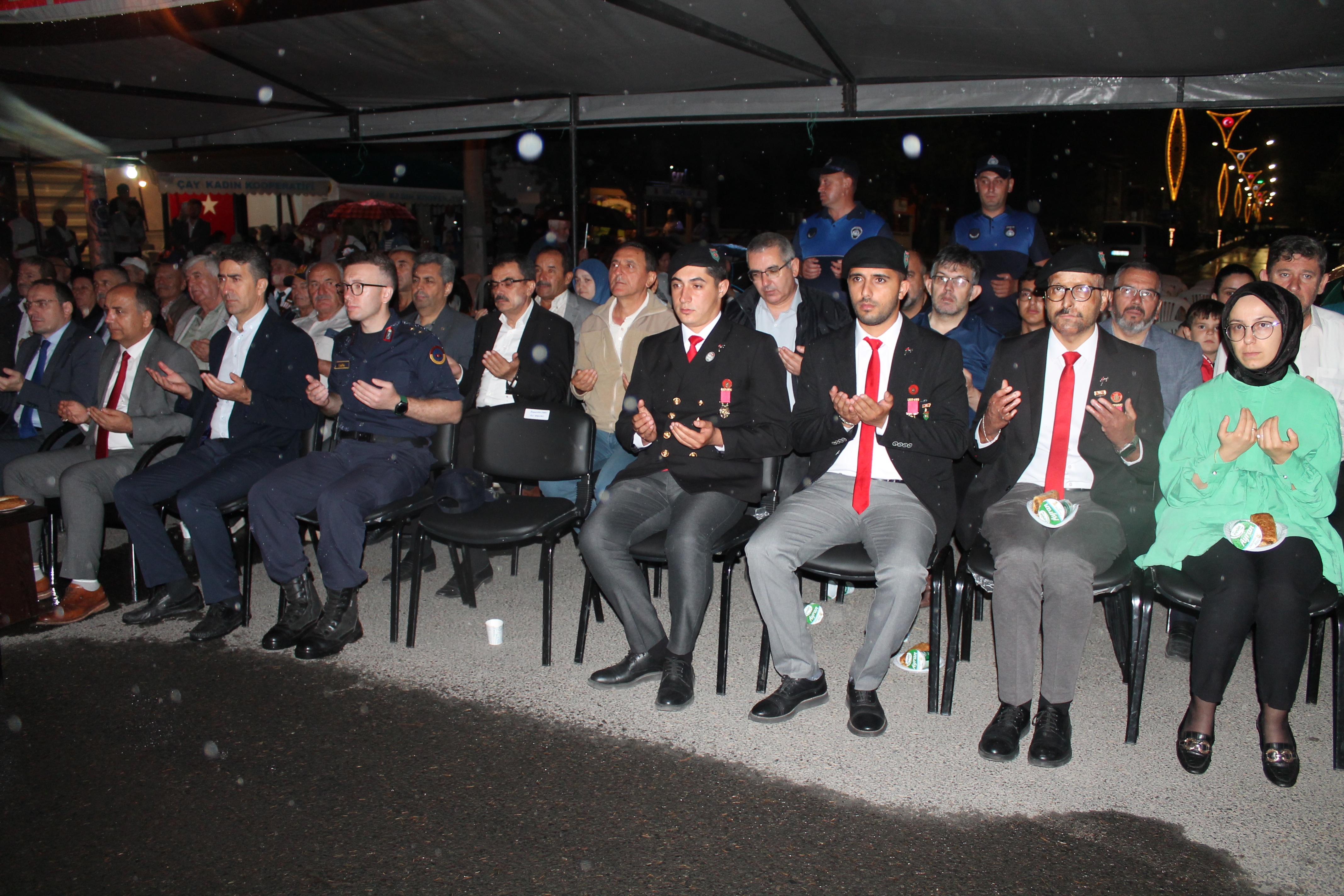 Çay İlçe Kaymakamlığı tarafından düzenlenen 15 Temmuz Demokrasi ve Milli Birlik Günü Programı Dörtyol Meydanında saat: 21.00’da başladı. Saygı duruşu ve ardından İstiklal Marşımız söylendi.