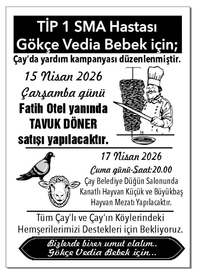 Ayrıca 17 Nisan Cuma günü akşam saat: 20.00’ da Çay Belediye Düğün Salonunda kanatlı ve küçükbaş hayvan mezatı yapılacak olup elde edilen gelir Gökçe Vedia bebeğin tedavisi için kullanılacak.