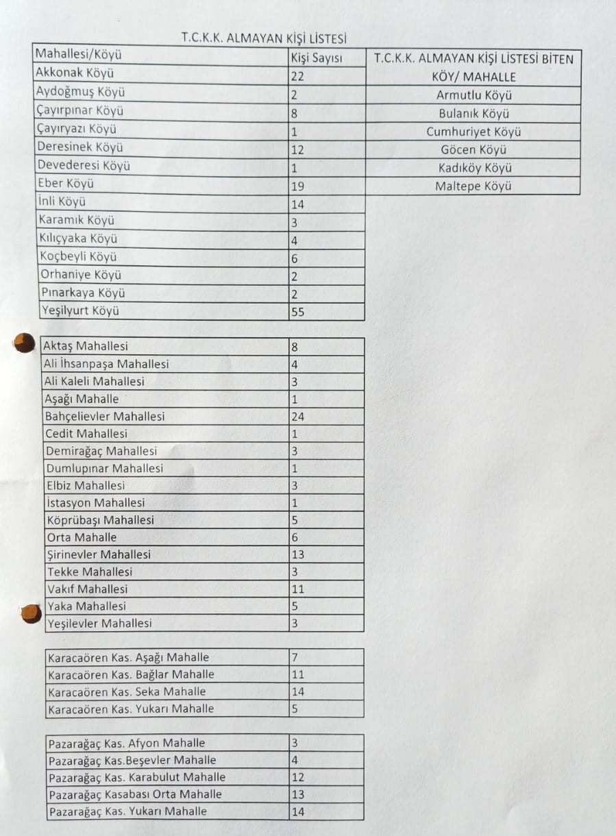 İlçe merkezde 95, Karacaören 37, Pazarağaç 46, köylerde ise 151 kişinin kimlik kartını yenilemediği görüldü.