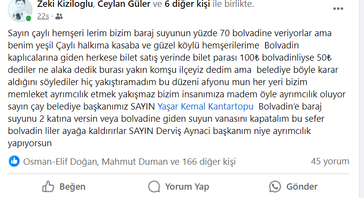 Kendsine ulaşarak olayı yaşayan kişi olarak konuştuğumuz Zeki Kızıloğlu açıklamasında; Heybeli Termal Tesislerine gittim, gişe görevlisi Bolvadin’de yaşayıp yaşamadığımı sordu. Bende Çaylıyım dedim. Giriş ücretini 100 lira aldı. Neden böyle yaptığını sordum, gişe görevlisi Aldığımız talimat böyle, Bolvadin’de ikamet ediyorsanız 50 lira, Bolvadin’de ikamet etmiyorsanız 100 lira dedi. Kaplıcadaki oda fiyatları da aynı şekilde, Hepimiz aynı ülkede yaşıyoruz, bu toprakların evladıyız bu yapılan haksızlığı ve ayrımcılığı kabul etmiyoruz dedi.