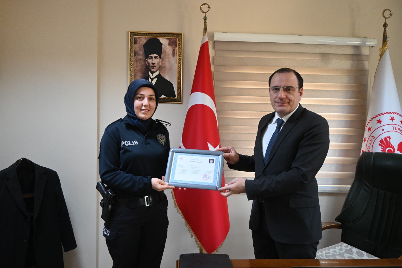 Kaymakam Türker: “Türk Polis Teşkilatının kuruluş yıldönümü vesilesiyle haftanızı kutluyorum. İlçemizin huzur ve güvenliğinin sağlanması konusunda üstün gayret ve başarılı çalışmalarından dolayı teşkilat mensuplarımızın Polis Haftasını kutluyor, başarılı çalışmalarının devamını diliyorum. Ayrıca görevi başında şehit düşerek aramızdan ayrılan polislerimizi rahmetle ve minnetle anıyor, gazi olan teşkilat mensuplarına da şükranlarımı sunuyorum” dedi. Kaymakam Türker, görev süresince üstlendiği görevleri ifa ederken göstermiş olduğu gayretli ve özverili çalışmalarından dolayı polis memuru Gülsüm Özdoğan'a başarı belgesi verdi.