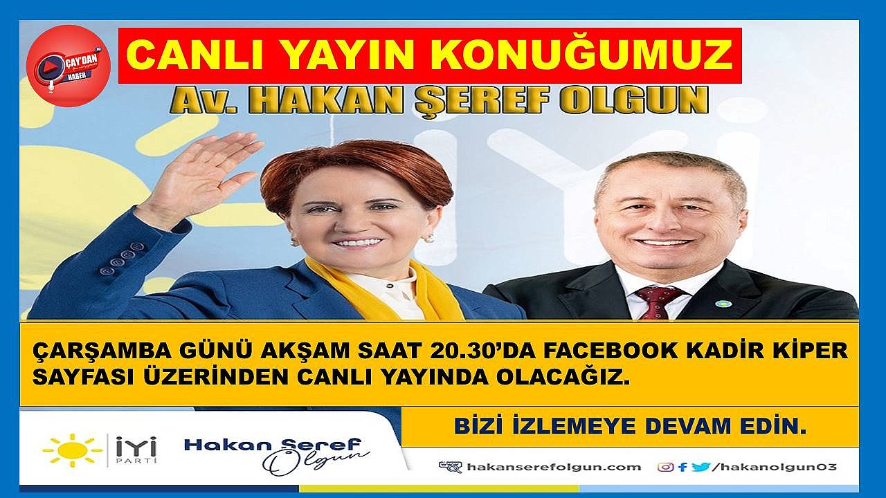 23 Ağustos Çarşamba günü akşam saat: 20.30'da Kadir Kiper facebook üzerinden yapacağımız canlı yayında konuğumuz İyi Parti Afyonkarahisar Milletvekili Av. Hakan Şeref Olgun olacak. Milletvekili Olgun’la gündeme dair her şeyi konuşup değerlendireceğiz.