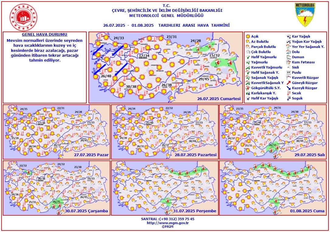 Sıcak havanın 30.07.2025 Çarşamba gününe kadar etkili olacağı değerlendirilmektedir. Bu süreçte, İl Merkezimizde sıcaklıkların 39 dereceye kadar çıkabileceği beklenmektedir.